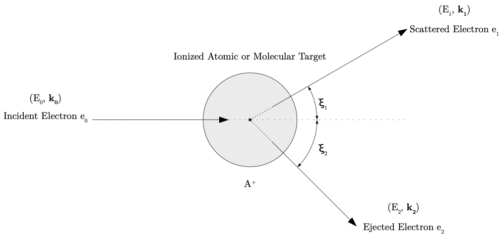 The kinematics of the ionization process by electron impact is shown in fig. 2.7, where the incident electron travels with an energy and momentum . Upon impact, the atomic or molecular target is ionized and becomes resulting in a scattered (or ejected) electron with energy and momentum , and an ejected (or scattered) electron with energy and momentum . The scattering angles of the outgoing electrons are denoted by and , to distinguish between them and the angles and used to describe the kinematics of the elastic and inelastic scattering processes in the previous sections. The ionization reaction with target can be expressed as: